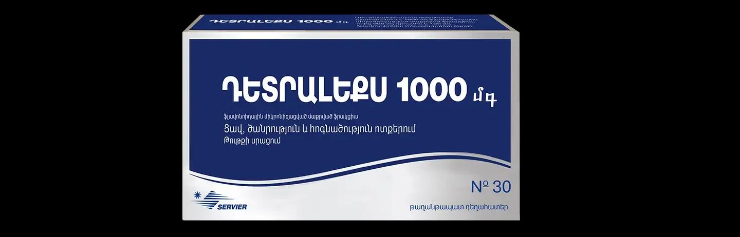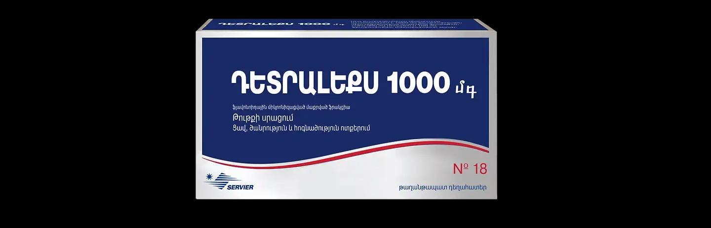 Դետրալեքս 1000: ֆլավոնոիդային միկրոնիզացված մաքրված ֆրակցիա – 1000 մգ, այդ թվում՝ դիոսմին – 90% (900 մգ), ֆլավոնոիդներ՝ հեսպերիդինի ձևով - 10% (100 մգ): Կիրառման ցուցումներ: Դետրալեքսը ցուցված է երակային և ավշային անբավարարությամբ պայմանավորված ախտանիշների (ցավ և ծանրություն ոտքերում, ոտքերի հոգնածություն և գիշերային ջղակծկումներ), թութքի սուր նոպայով պայմանավորված ֆուկցիոնալ ախտանիշների։*Կիրառման ցուցումներ, եղանակներ և դեղաչափեր: Մեծահասակների համար թույլատրելի օրական դեղաչափը 1 դեղահատն է, որը նախընտրելի է ընդունել առավոտյան՝ ուտելու ընթացքում: Թութքի նոպայի դեպքում՝ դեղաչափը կարող է հասնել մինչև 1 դեղահատ 3 անգամ օրական։ Հակացուցումներ: Դետրալեքսը հակացուցված է ակտիվ բաղադրատարրի և/կամ օժանդակ նյութերից որևէ մեկի նկատմամբ գերզգայնություն ունեցող պացիենտներին: *Կիրառման հատուկ հրահանգներ և նախազգուշացումներ: Թութքի սրացման ժամանակ Դետրալեքսի նշանակումը չի փոխարինում ուղիղաղիքային խանգարուﬓերի հատուկ բուժմանը։ Եթե ախտանիշներն արագ չեն անհետանում, ապա անհրաժեշտ է իրականացնել պրոկտոլոգիական հետազոտություն և վերանայել բուժումը: Փոխազդեցությունն այլ դեղաﬕջոցների հետ՝ չի արձանագրվել։ Կիրառումը հղիության և կրծքով կերակրելու շրջանում ցանկալի չէ Դետրալեքս դեղը օգտագործել *Կողմնակի ազդեցություններ: Հաճախակի թեթև (ոչ ծանր) կողմնակի ազդեցություններ փորլուծություն, մարսողության խանգարումներ, սրտխառնոց, փսխում: Ոչ հաճախ՝ կոլիտներ։ Հազվադեպ՝ գլխապտույտ, գլխացավ, ընդհանուր թուլություն ցանավորում, քոր, եղնջացան։ Անհայտ հաճախականությամբ՝ որովայնային ցավ, դեմքի, լեզվի, կոպերի անգիոայտուց: Կվինկեի այտուցի եզակի դեպքեր: *Դեղաբանական հատկություններ: Դետրալեքսը ազդում է երակային արյան վերադարձն ապահովող համակարգի վրա, նվազեցնում է երակների լայնացումն ու արյան կանգը, կարգավորում է մազանոթների թափանցելիությունը, բարձրացնում է դրանց դիմադրողականությունը: